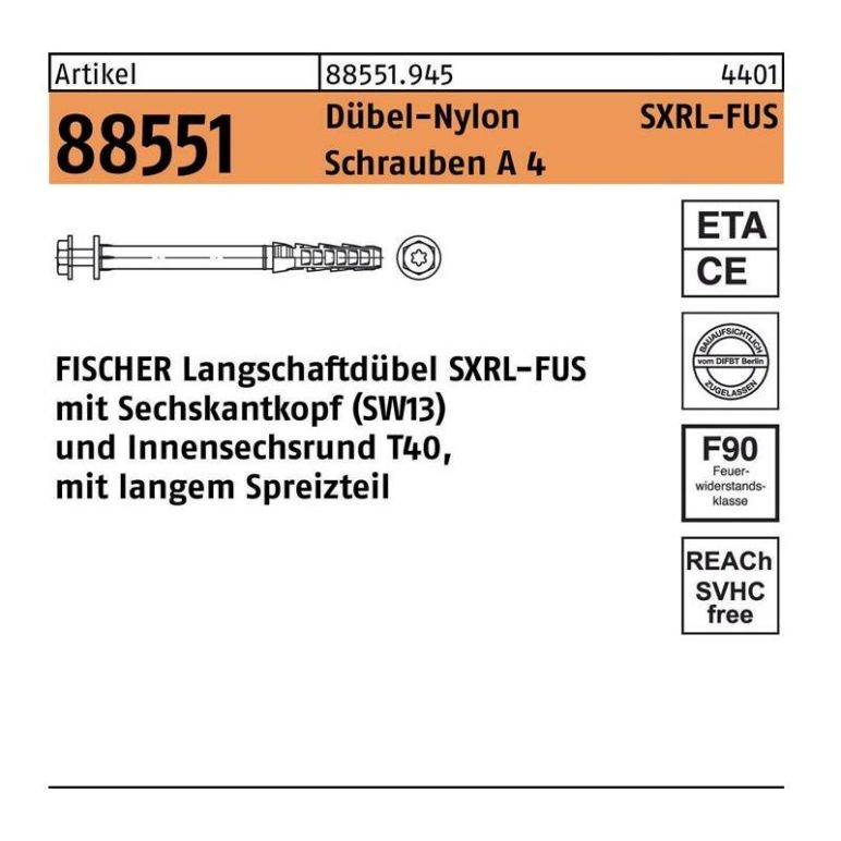 Artikel 88551 Dübel-Nylon SXRL-FUS Schrauben A 4 FISCHER Langschaftdüb. SXRL-FUS mit Sechskantkopf und Innensechsrund - Abmessung: SXRL 10 x160 FUS VE=S (50 Stück) Weitere technische Eigenschaften: · Gruppencode 88551.945· Normart REYHER-Artikel 88551 Inhaltsmenge: 50 Stück pro Kartonage Bohrer-Ø d0 10 Dübellänge l 160 Ausführung FISCHER Langschaftdübel SXRL-FUS mit Sechskantkopf (SW13) und Innensechsrund T40, mit langem Spreizteil Verpackungsgröße 50.00 Werkstoff Schrauben A 4/Dübel-Nylon Typ SXRL-FUS