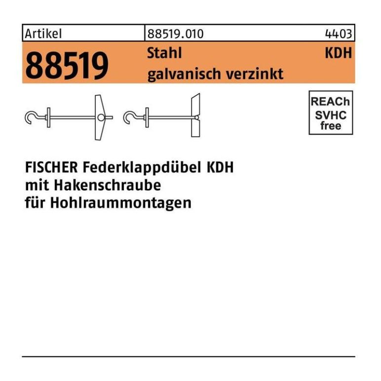 Artikel 88519 Stahl KDH galvanisch verzinkt FISCHER Federklappdübel KDH mit Hakenschraube für Hohlraummontagen - Abmessung: KDH 6 x 130 VE=S (20 Stück) Weitere technische Eigenschaften: · Material: Stahl · Durchmesser 6mm· Gruppencode 88519.010· Normart REYHER-Artikel 88519· Oberfläche galvanisch verzinkt· Produkt-Typbezeichnung FISCHER Federklappdübel KDH mit Hakenschraube für Hohlraummontagen Inhaltsmenge: 20 Stück pro Kartonage Verpackungsgröße 20.00 Typ KDH