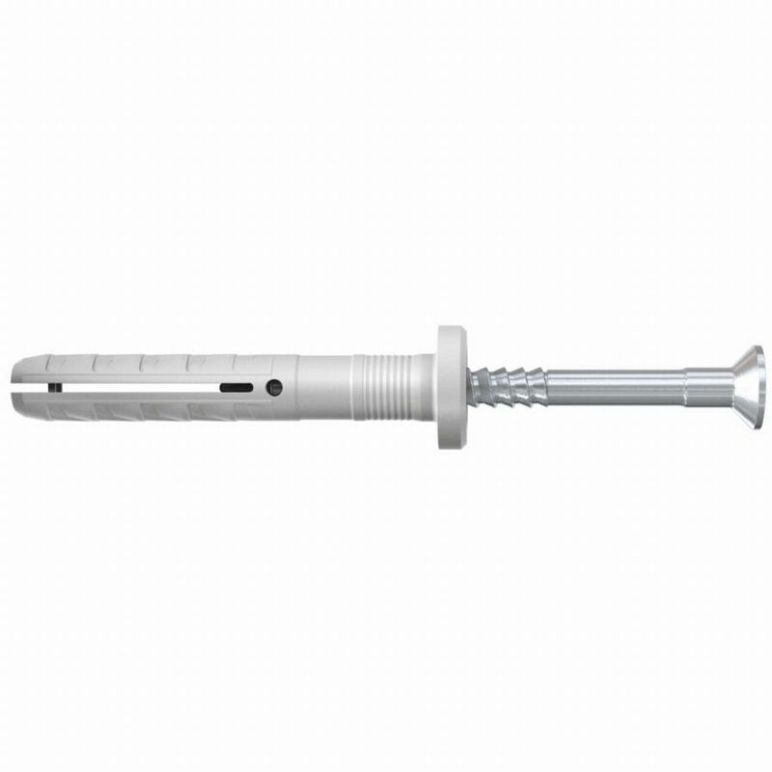 Details: Der N-F Schlagdübel mit Flachkopf besteht aus einem hochwertigen Nylondübel und einem Nagel aus elektrolytisch verzinktem Stahl. Die Elemente sind vormontiert, um eine schnelle Installation zu ermöglichen. Der Schlagdübel eignet sich für die schnelle Durchsteckmontage. Wenn der Nagel eingeschlagen wird, spreizt sich der Dübel auf und verankert sich sicher im Baumaterial. Der Schlagdübel N-F mit Flachkopf ist ideal für die Befestigung von Metallkonstruktionen in allen Baumaterialien im Innenbereich. Eigenschaften : Nenndurchmesser des Bohrers d0 6 [mm]. Dübellänge l 80 [mm] min. Bohrtiefe für Durchsteckmontage h2 95 [mm]. Max. Dicke des zu befestigenden Bauteils t fix 50 [mm]. PZ2-Aufnahme Verpackung Dose mit Ausguss. Menge 100 [St.]. Diamètre nominal du foret d0 6 [mm] Longueur de cheville l 80 [mm] profondeur de perçage mini. pour installation traversante h2 95 [mm] Épaisseur maxi. de la pièce à fixer t fix 50 [mm] empreinte PZ2 Conditionnement Boite à bec verseur Quantité