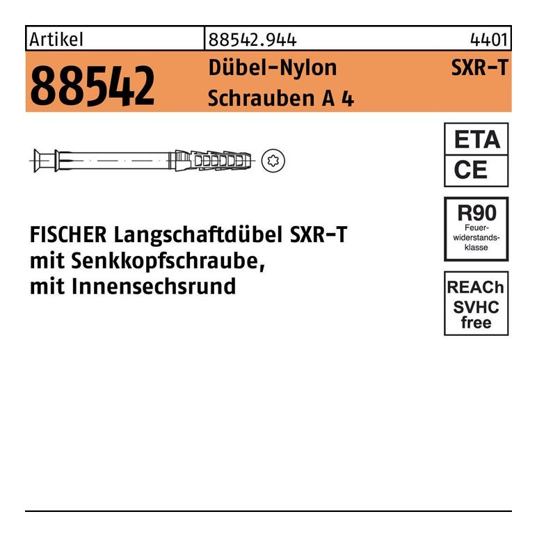 Artikel 88542 Dübel-Nylon SXR-T Schrauben A 4 FISCHER Langschaftdübel SXR-T mit Senkkopfschraube · Innensechsrund - Abmessung: SXR 10x 80 T VE=S (50 Stück)Weitere technische Eigenschaften:· Material: Schrauben A 4/Dübel-Nylon· Gruppencode 88542.944· Normart REYHER-Artikel 88542