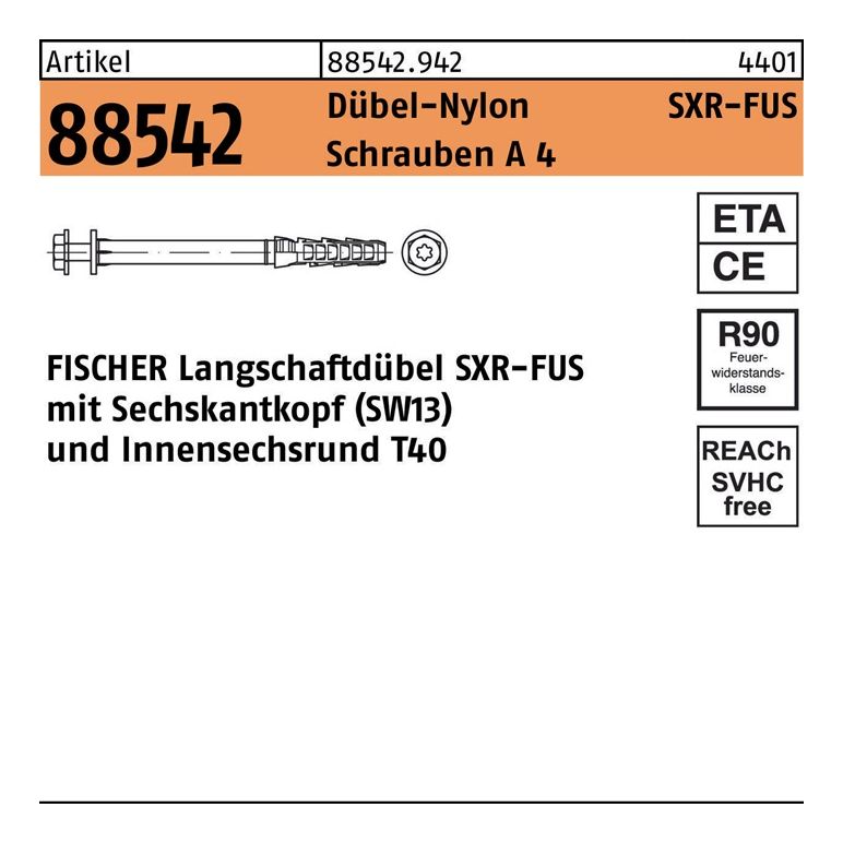 Artikel 88542 Dübel-Nylon SXR-FUS Schrauben A 4 FISCHER Langschaftdübel SXR-FUS mit Sechskantkopf (SW13) und ISR T40 - Abmessung: SXR 10x 60 FUS VE=S (50 Stück)Weitere technische Eigenschaften:· Material: Schrauben A 4/Dübel-Nylon· Gruppencode 88542.942· Normart REYHER-Artikel 88542