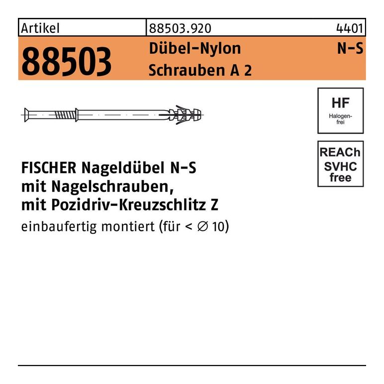 Artikel 88503 Dübel-Nylon N-S Schrauben A 2 FISCHER Nageldübel N-S mit Nagelschrauben · mit Pozidriv-KS Z - Abmessung: N-S 6 x 40/10 VE=S (50 Stück)Weitere technische Eigenschaften:· Typ: N-S· Gruppencode 88503.920· Normart REYHER-Artikel 88503