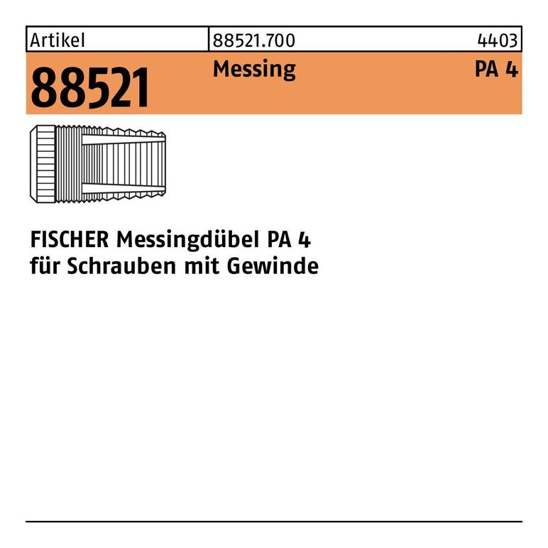 Artikel 88521 Messing PA 4 FISCHER Messingdübel PA 4 für Schrauben mit Gewinde - Abmessung: PA 4 M 6/ 7,5 VE=S (200 Stück)Weitere technische Eigenschaften:· Material: Ohne Oberflächenangabe · Messing· Gruppencode 88521.700· Normart REYHER-Artikel 88521· Produkt-Typbezeichnung FISCHER Messingdübel PA 4 für Schrauben mit Gewinde