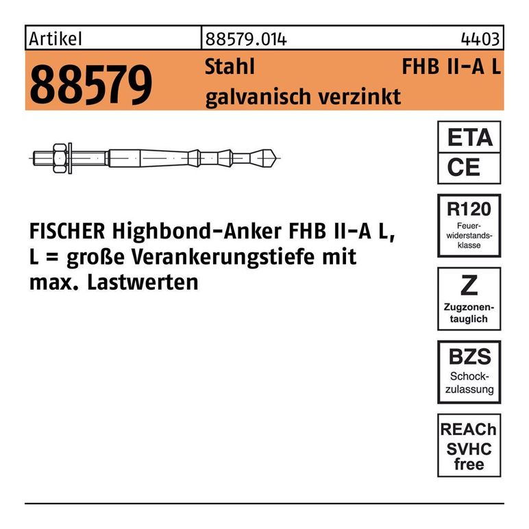 Artikel 88579 Stahl FHB II-A L galvanisch verzinkt FISCHER Highbond-Anker FHB II-A L · große Verankerungstiefe - Abmessung: M 16 x 160/ 60 VE=S (10 Stück)Weitere technische Eigenschaften:· Durchmesser 16mm· Gruppencode 88579.014· Länge 160mm· Normart REYHER-Artikel 88579· Oberfläche galvanisch verzinkt