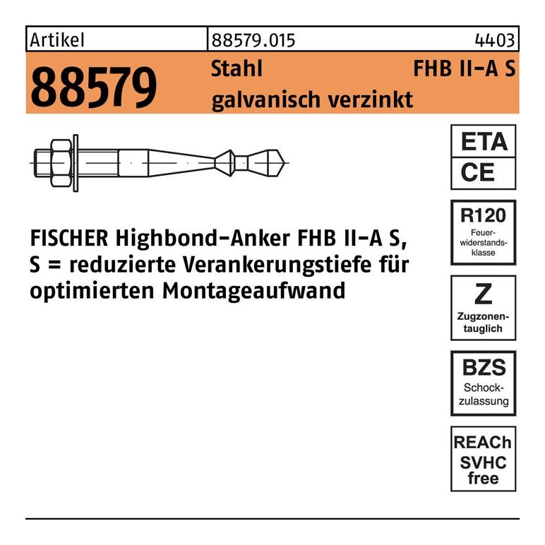 Artikel 88579 Stahl FHB II-A S galvanisch verzinkt FISCHER Highbond-Anker FHB II-A S · reduzierte Verankerungstiefe - Abmessung: M 10 x 60/ 20 VE=S (10 Stück)Weitere technische Eigenschaften:· Durchmesser 10mm· Gruppencode 88579.015· Länge 60mm· Normart REYHER-Artikel 88579· Oberfläche galvanisch verzinkt
