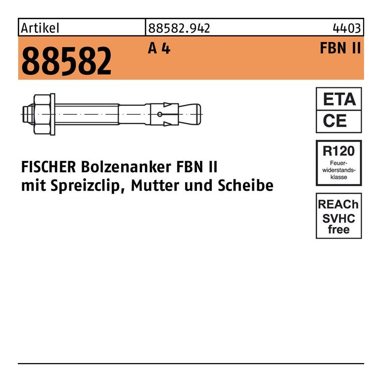 Artikel 88582 A 4 FBN II FISCHER Bolzenanker FBN II mit Spreizclip · Mutter und Scheibe - Abmessung: FBN II 20/ 30 VE=S (10 Stück)Weitere technische Eigenschaften:· Gruppencode 88582.942· Länge 30mm· Normart REYHER-Artikel 88582