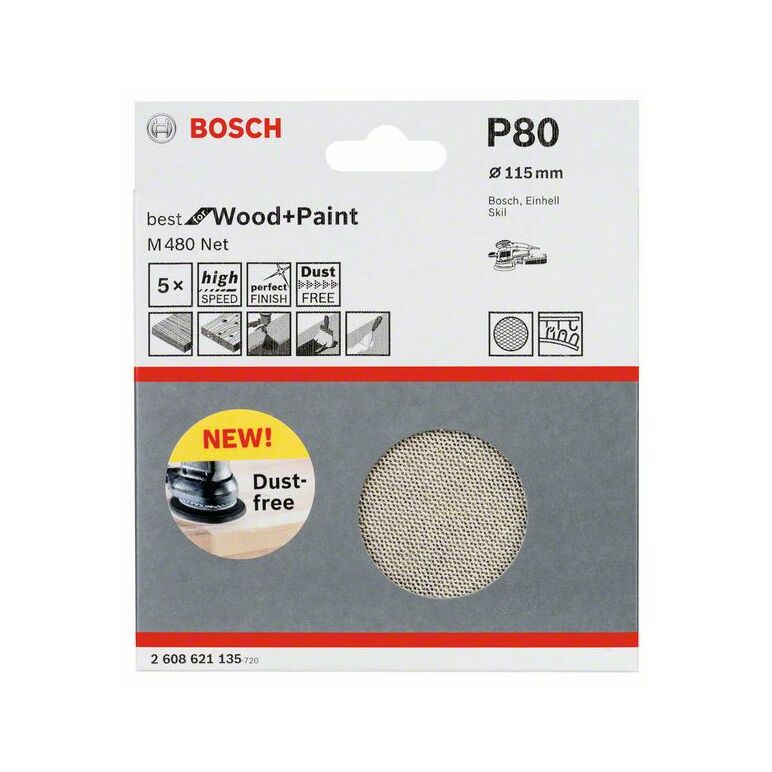 Bosch Schleifblatt M480 Net, Best for Wood and Paint, 115 mm, 80, 5er-Pack (2 608 621 135)