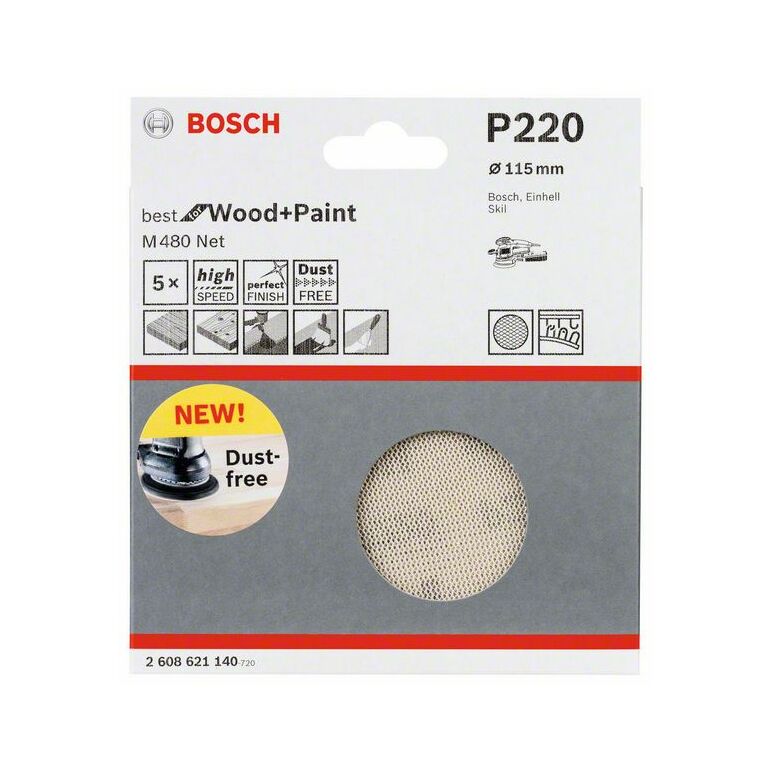 Bosch Schleifblatt M480 Net, Best for Wood and Paint, 115 mm, 220, 5er-Pack (2 608 621 140)