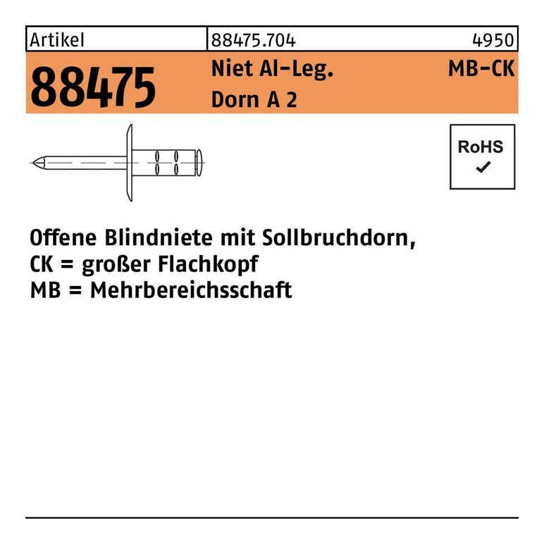 Artikel 88475 Niet Al-Leg. MB-CK Dorn A 2 Offene Blindniete mit Sollbruchdorn · großer Flachkopf · Mehrbereichsschaft - Abmessung: 4,8x17 K16 VE=S (250 Stück)Weitere technische Eigenschaften:· Gruppencode: 88475.704· Normart: REYHER-Artikel 88475· Produkt-Typbezeichnung: Offene Blindniete mit Sollbruchdorn, CK = großer Flachkopf MB = Mehrbereichsschaft