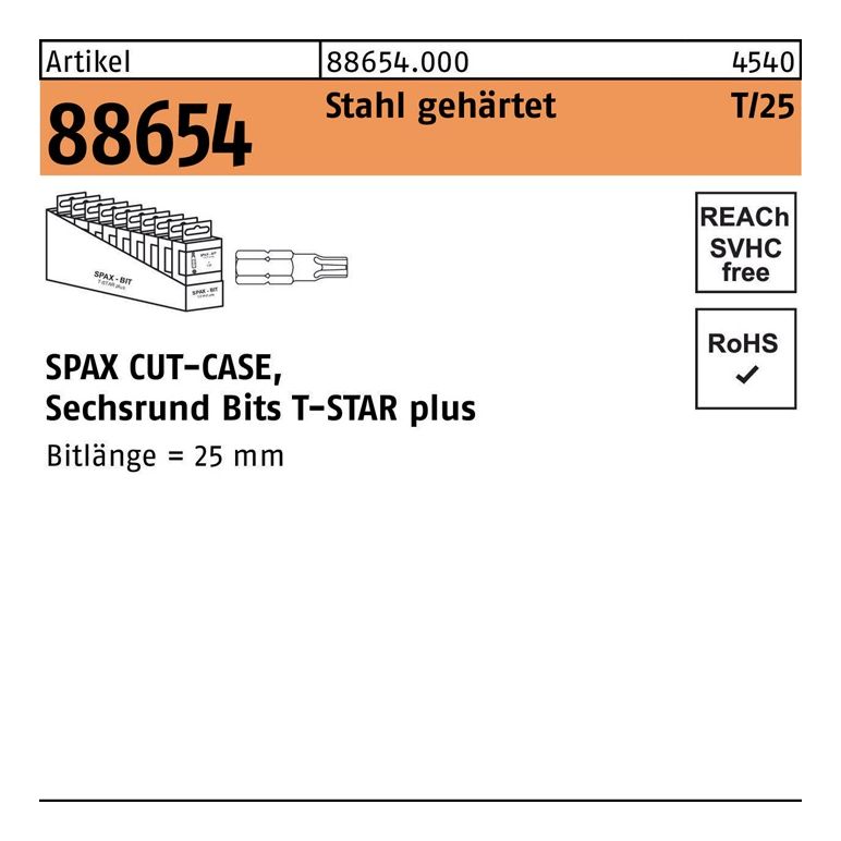 Artikel 88654 Stahl gehärtet T/25 SPAX CUT-CASE · Sechsrund Bits T-STAR plus - Abmessung: SW 1/4x25 T 20 VE=K (50 Stück)Weitere technische Eigenschaften:· Gruppencode 88654.000· Normart REYHER-Artikel 88654· Oberfläche Ohne Oberflächenangabe· Werkstoff Stahl gehärtet