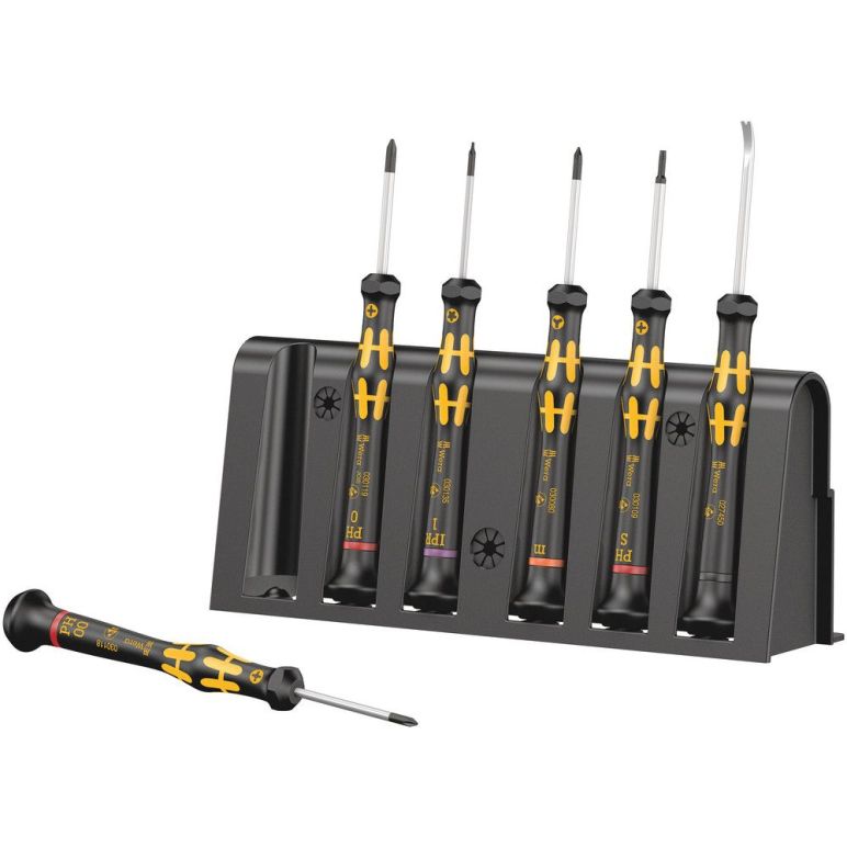 Elektrostatisch abgesicherter 6-teiliger Wera Micro Schraubendrehersatz. Enthaltene Schraubprofile besonders geeignet für den Einsatz an Mobiltelefonen und Tablets. Sicherer Schutz vor elektrostatischer Energie und damit verbundenen Schäden. Durch Abstützen der Hand auf der Drehkappe und durch die Schnelldrehzone unterhalb der Drehkappe ist blitzschnelles Zwirbeln möglich. Zeitintensives Umgreifen entfällt. Kraftzone mit integrierten Weichzonen sorgt für die Übertragung hoher Löse- und Anzugsmomente. Präzisionszone für den richtigen Drehwinkel bei Justierarbeiten. Die Wera Black Point-Spitze bietet Passgenauigkeit und optimierten Korrosionsschutz. Take it easy Werkzeugfinder mit Farbkennzeichnung nach Profilen und Größenstempelung - zum einfachen und schnellen Finden des benötigten Werkzeugs.