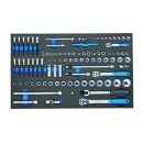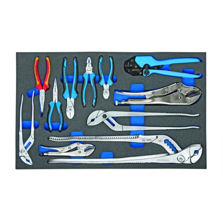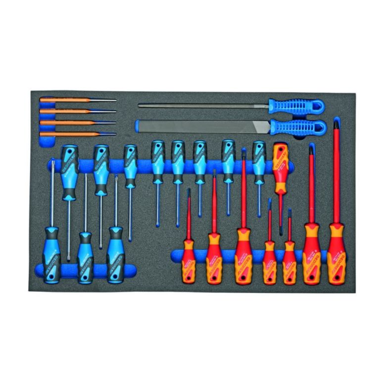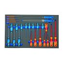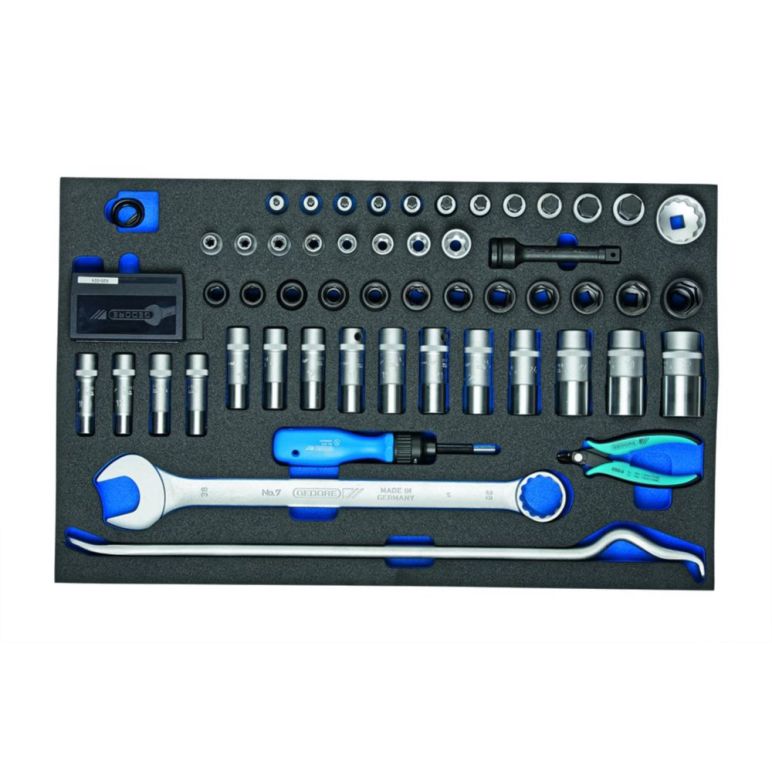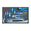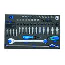 Jedes Werkzeug liegt verrutschsicher in eigener Aussparung, durch Griffmulden leicht herausnehmbar