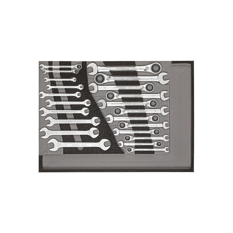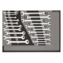 Ringratschenmaulschlüssel: In Anlehnung an DIN 3113, ISO 3318, gerade Form, Ratschenmechanismus mit 72 Zähnen, Rückschwenkwinkel 5°, Maulstellung 15°, Oberfläche matt-satiniert verchromt, Chrom-Vanadium-Stahl