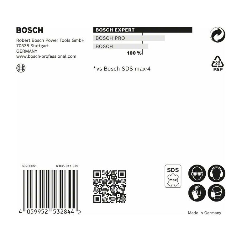 Herausragende Lebensdauer in Stahlbeton! Durchdringt Stahlbeton mittels 4 Schneiden Vollhartmetalkopf. Das Bohren durch Stahlbeton ist eine schwierige Aufgabe, die den Hammerbohrern viel abverlangt. Sogar 4-Schneider nutzen sich schnell ab. Beim Wechseln des Zubehörs und beim Kaufen von Verbrauchsmaterialien kommt es zu Ausfallzeiten. Der Vollhartmetalkopf auf dem EXPERT SDS max-8X ist ein fortschrittlicher 4-Schneider, der aus einem einzigen Stück des härtesten Metalls besteht: Es verklemmt nicht und zeigt keine Schwäche beim Hammerbohren. Für Bauprofis, die regelmäßig Beton und Stahlbeton bohren, z. B. für schwere Anker oder Armierungsverlängerungen. Der Bosch EXPERT SDS max-8X Hammerbohrer bietet eine unvergleichliche Leistung, Zuverlässigkeit und Langlebigkeit. Es ist DAS EXPERTen-Zubehör für SDS max Bohrhämmer. Extrem belastbare Bohrerspitze mit Bosch Carbide Technology.