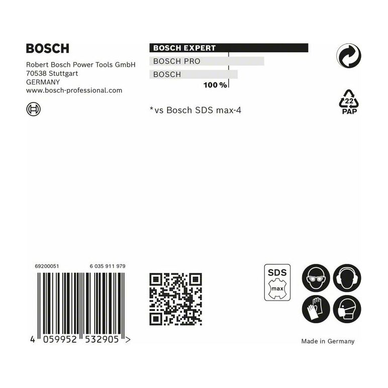Herausragende Lebensdauer in Stahlbeton! Durchdringt Stahlbeton mittels 4 Schneiden Vollhartmetalkopf. Das Bohren durch Stahlbeton ist eine schwierige Aufgabe, die den Hammerbohrern viel abverlangt. Sogar 4-Schneider nutzen sich schnell ab. Beim Wechseln des Zubehörs und beim Kaufen von Verbrauchsmaterialien kommt es zu Ausfallzeiten. Der Vollhartmetalkopf auf dem EXPERT SDS max-8X ist ein fortschrittlicher 4-Schneider, der aus einem einzigen Stück des härtesten Metalls besteht: Es verklemmt nicht und zeigt keine Schwäche beim Hammerbohren. Für Bauprofis, die regelmäßig Beton und Stahlbeton bohren, z. B. für schwere Anker oder Armierungsverlängerungen. Der Bosch EXPERT SDS max-8X Hammerbohrer bietet eine unvergleichliche Leistung, Zuverlässigkeit und Langlebigkeit. Es ist DAS EXPERTen-Zubehör für SDS max Bohrhämmer. Extrem belastbare Bohrerspitze mit Bosch Carbide Technology.