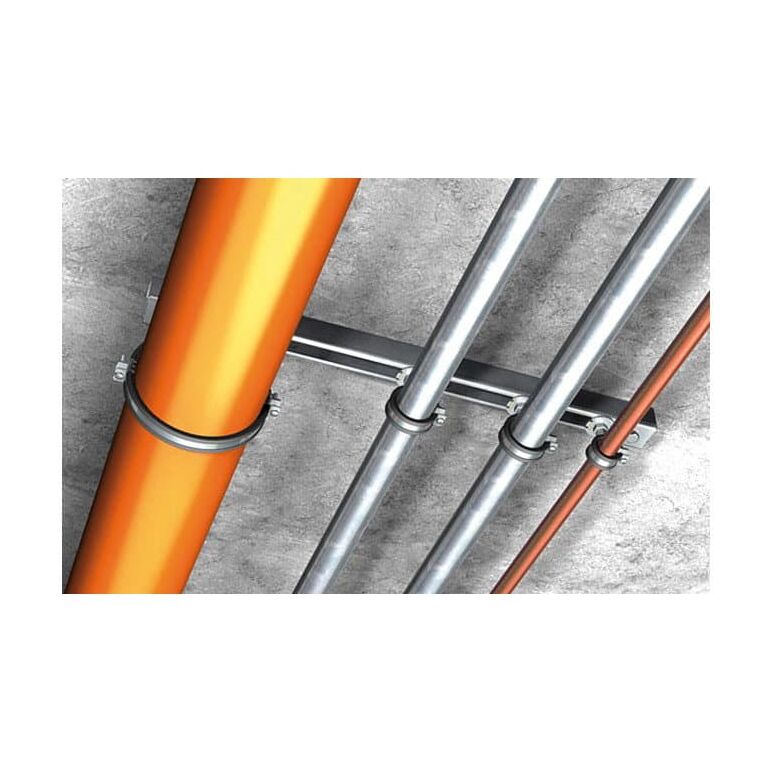 Die fischer Rohrschelle FRS Triple ist eine zweischraubige Rohrschelle aus galvanisch verzinktem Stahl der Werkstoffgüte DD11 mit Dreifach-Anschlussgewinde M 8/M 10 und ½“. Der Schnellverschluss ermöglicht eine einfache und zeitsparende Montage. Die Ausführung mit zwei Schrauben garantiert die optimierte Anpassung an den Rohraußendurchmesser. Zusammen mit dem Dreifach-Anschlussgewinde erhöht dies die Flexibilität. Damit können Rohrleitungen mit einem Außendurchmesser von 15 - 169 mm mit Gewindestange oder Stockschraube im Innenbereich sicher befestigt werden. Die Rohrschelle entspricht mit einer chlor- und silikonfreien Schalldämmeinlage den Anforderungen der DIN 4109. Die fischer FRS ist für Anwendungen im Temperaturbereich von -50 °C bis +100 °C geeignet.