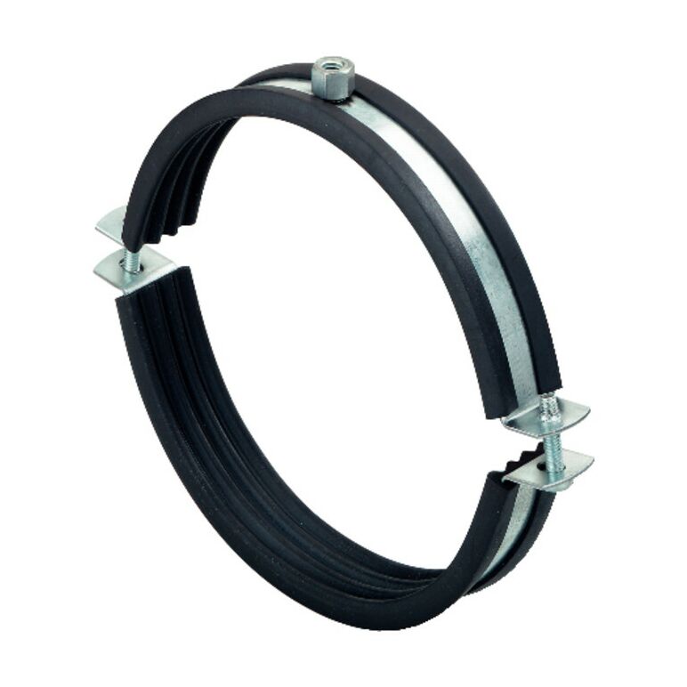 Die fischer Lüftungsrohrschelle LGS 630 für Nenngröße 630 mm, zweiteilige Ausführung mit eingeklebter Schalldämmeinlage zur Befestigung von Wickelfalzrohren oder Kunststoffrohren. Der große Öffnungswinkel der LGS lässt eine schnelle und einfache Montage zu. Die Zweischraubigkeit ermöglicht die optimierte Anpassung auf den Rohraußendurchmesser. Anschlussmutter mit Kombigewinde M8 / M10 zur Aufnahme von Gewindestangen oder Stockschrauben. Beide Schellenhälften sind gelocht für die Verbindung mit zwei Schrauben oder Gewindestangen mit Muttern. Dadurch wird eine Verdoppelung der empfohlenen Last ermöglicht.