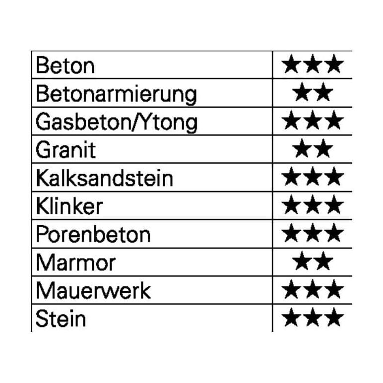 höchste Lebensdauer · stabile Kopfgeometrie · hält selbst Armierungstreffern stand · äußerst schneller Bohrmehltransport ohne Verpuffung aufgrund breiter Wendelform · vibrationsoptimierte Wendel · zertifiziert durch die Prüfgemeinschaft Mauerbohrer (PGM) nach Anforderungen des Deutschen Instituts für Bautechnik (DIBt) Anwendungsbereiche: Beton, armierter Beton, Stein, Kalksandstein, Mauerwerk, Marmor und Klinker Weitere technische Eigenschaften: · Typ: Y-CUTTER SDS-max